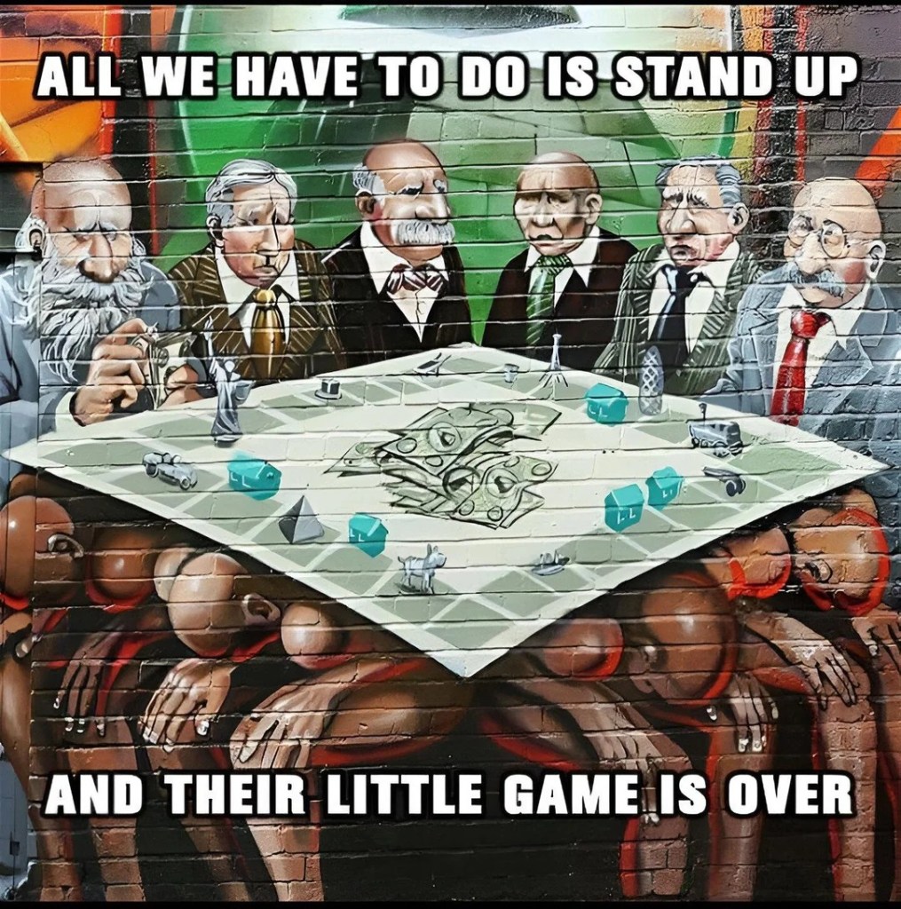 There’s a poster that shows politicians seated at a table, its legs made up of poor people holding it up. The caption reads: “All we have to do is stand up, and it’s game over.” That is still true. But the first step is to open our eyes and see who’s really at that table, and who is being crushed underneath it.